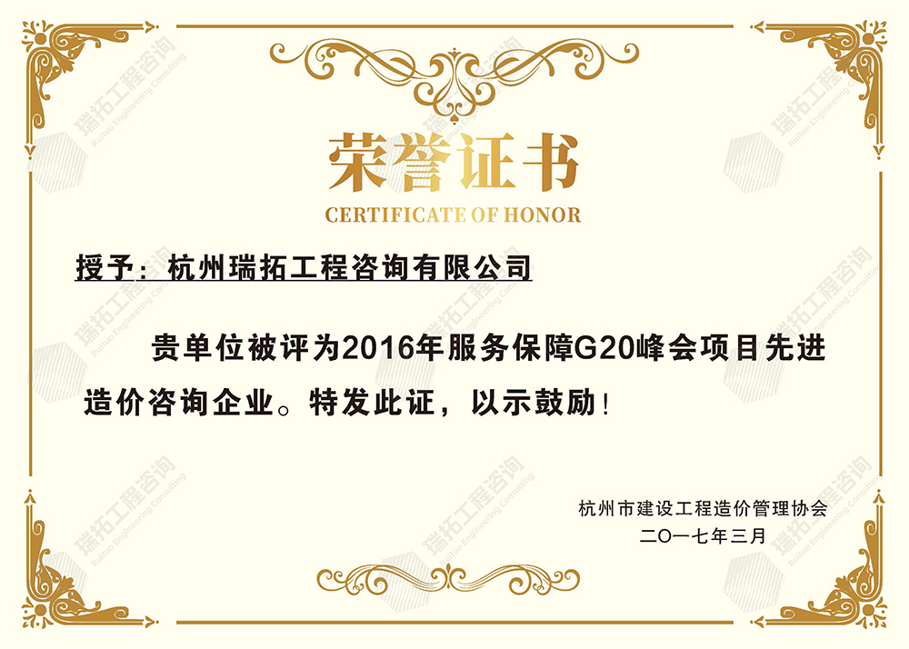 2016年服務(wù)保障G20峰會(huì)項(xiàng)目先進(jìn)造價(jià)咨詢企業(yè)