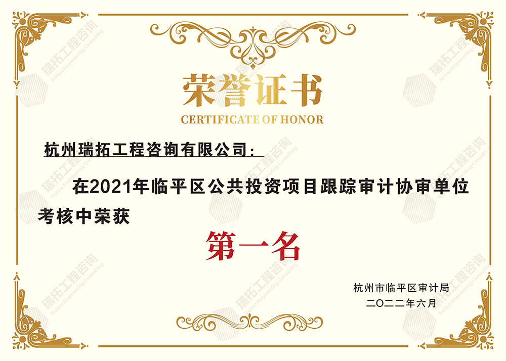 2021年度臨平區(qū)公共投資項(xiàng)目跟蹤審計(jì)協(xié)審單位考核中榮獲第一名